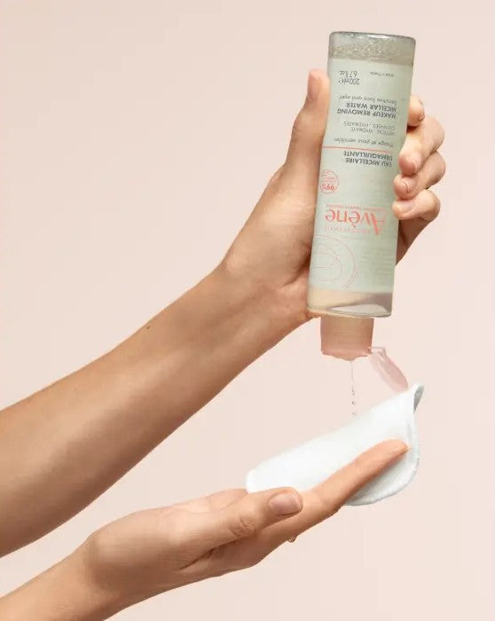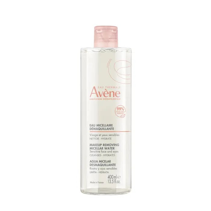 This make-up removing micellar water cleanses (even pollution particles*), hydrates** and soothes sensitive face and eyes in one easy step. It contains 99% ingredients of natural origin and none of animal origin. On a daily basis, this delicately fragranced refreshing water removes make-up and brings softness in one simple, rapid step. It improves hydration and preserves the skin's natural balance thanks to the combination of Glycerin and Trehalose, and the high concentration of Avène Thermal Spring Water with its soothing properties. Its formula contains a minimum of ingredients at just the right amount to ensure efficacy and tolerance***. Leaves skin clear, soft, soothed and comfortable. The make-up removing micellar water is suitable for contact lens wearers. The 400 mL Make-up removing micellar water packaging is made of 87% recycled materials. The bottle is made of 100% recycled plastic****.